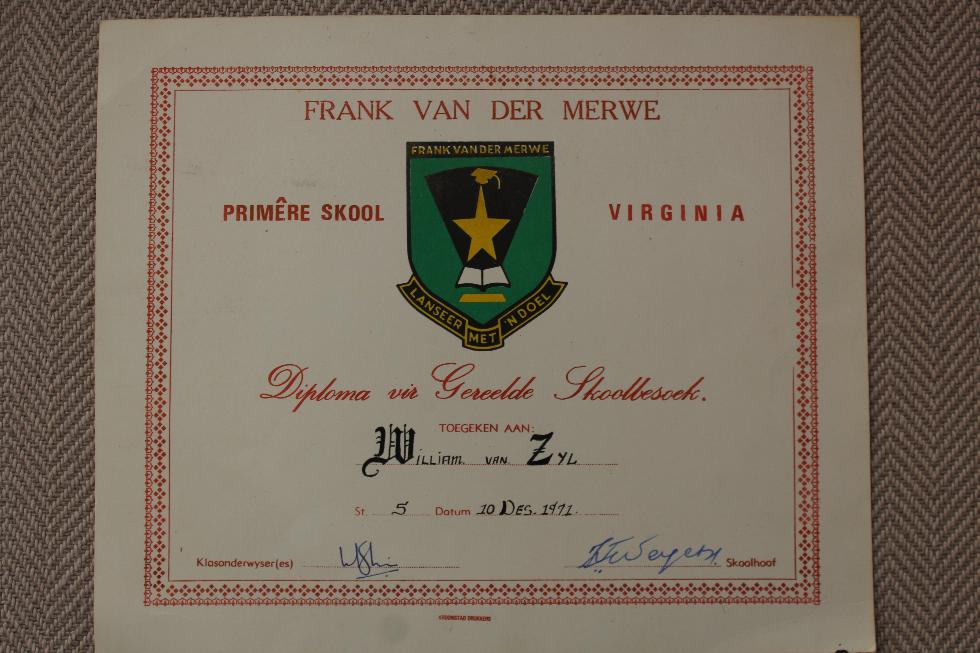 Typical certificate school attendance Primêre Skool Frank Van Der Merwe (Primary School) 1971. Regular School Attendance. Gereelde skoolbesoek. Signed by Mr F.T. Weyers principal at the time.
