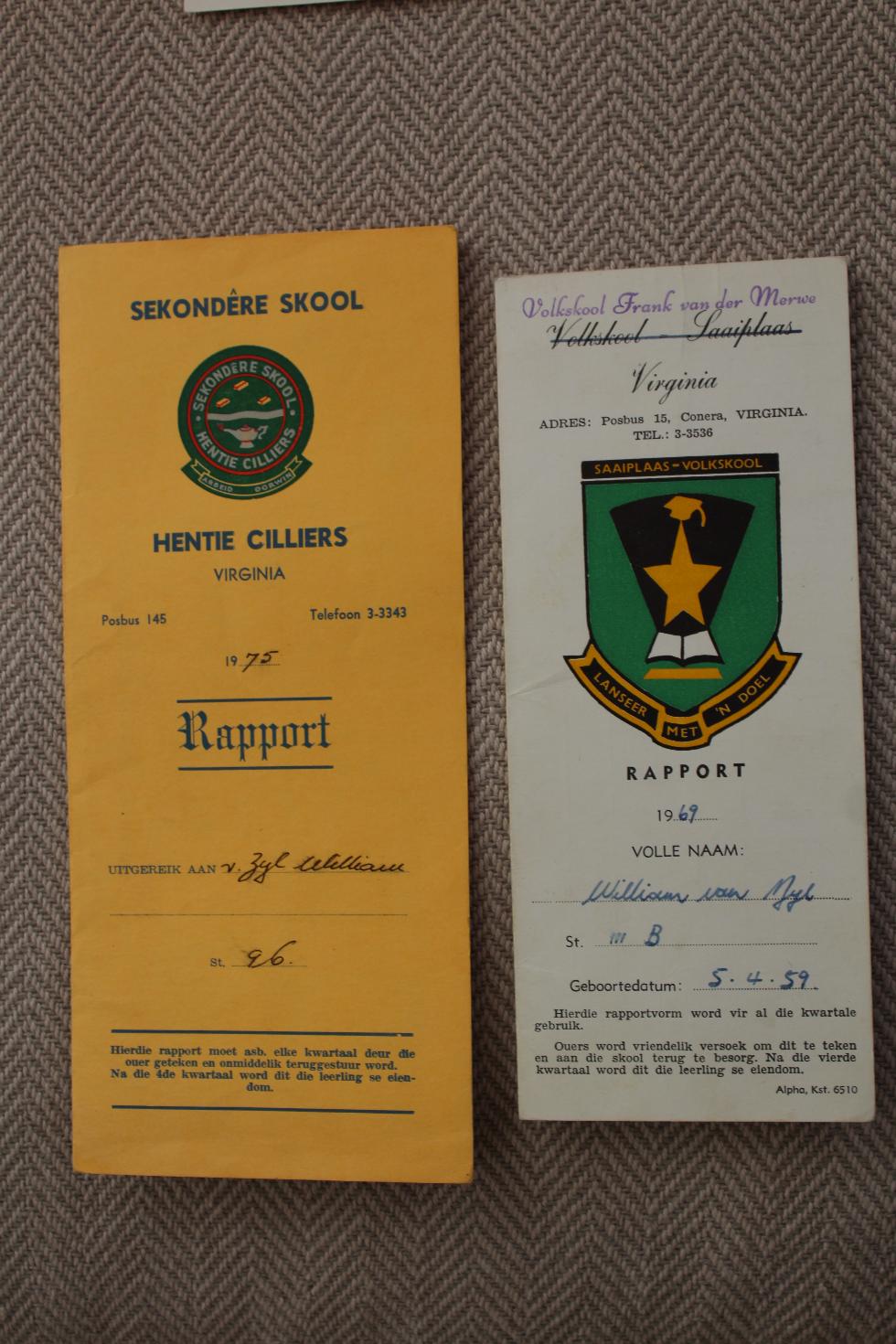 Typical reports Hoërskool Hentie Cilliers 1975 (secondary school) & Volkskool Frank Van Der Merwe 1967 (primary school). Tipiese skoolrapporte Hoërskool Hentie Cilliers 1975 & Volkskool Frank Van Der Merwe 1967.