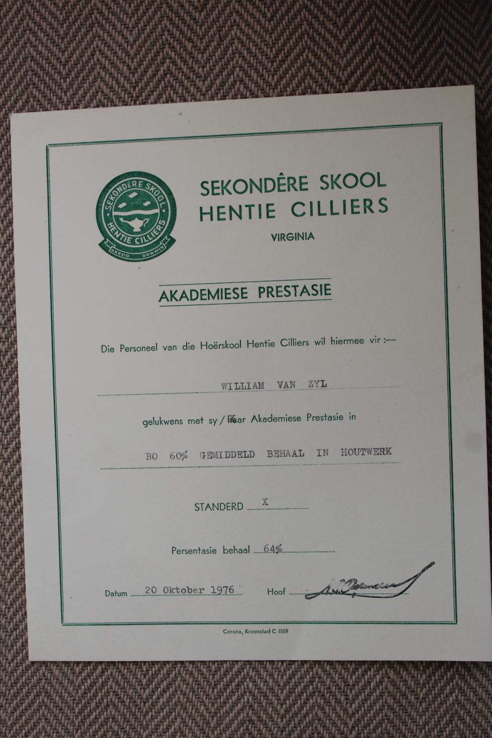 Typical certificate Hoërskool Hentie Cilliers 1976. Typical academic certificate Hentie Cilliers High School 1976. Signed by Mr P. S. Odendaal the principal at the time. Woodwork (Houtwerk).