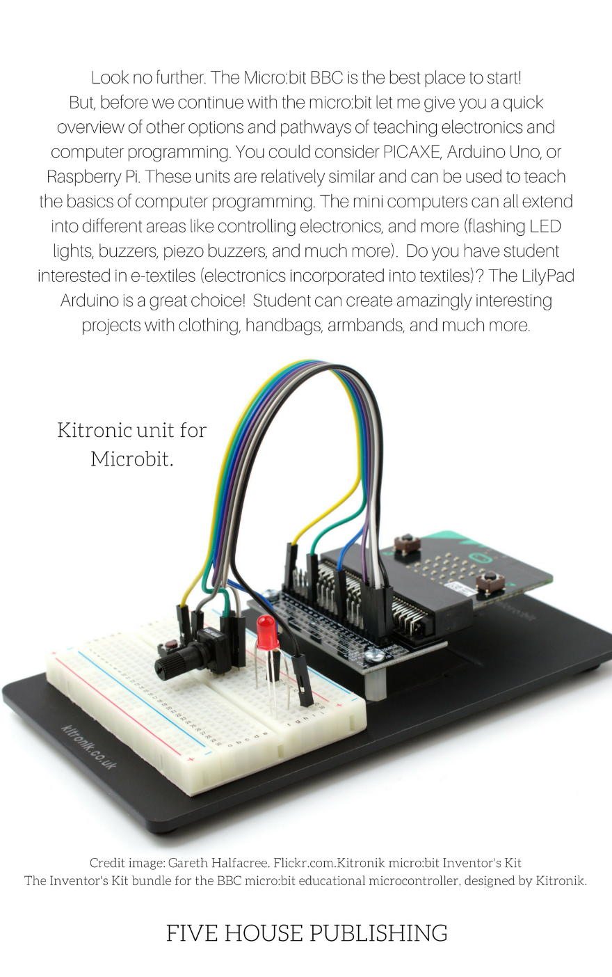 Micro:bit, PICAXE, Arduino Uno, Raspberry Pi, LilyPad Arduino, Gemma Flora, computer programming, STEM, project-based, microprocessor, electronics, e-textiles, LED lights, buzzers, piezo buzzers, Kitronic Inventor’s kit, Python code, Java Script, coding, programming, papermaking, copper tape, pop-up greeting card.