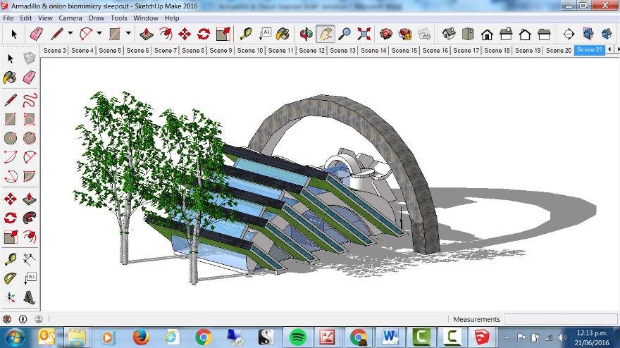 SketchUp model illustrating the shadows function (Armadillo and Onion inspired building): The deciduous trees provide shade during the hot summer months (keeping the building cool). However, during winter the deciduous trees shed its leaves. The sun enters the building through well-planned windows, heating up the concrete walls and floors (Passive Solar Principle). Credit: Author. See the eBook by the author at Five House Publishing using bio-mimetics (ask nature) to inform sustainable practice: